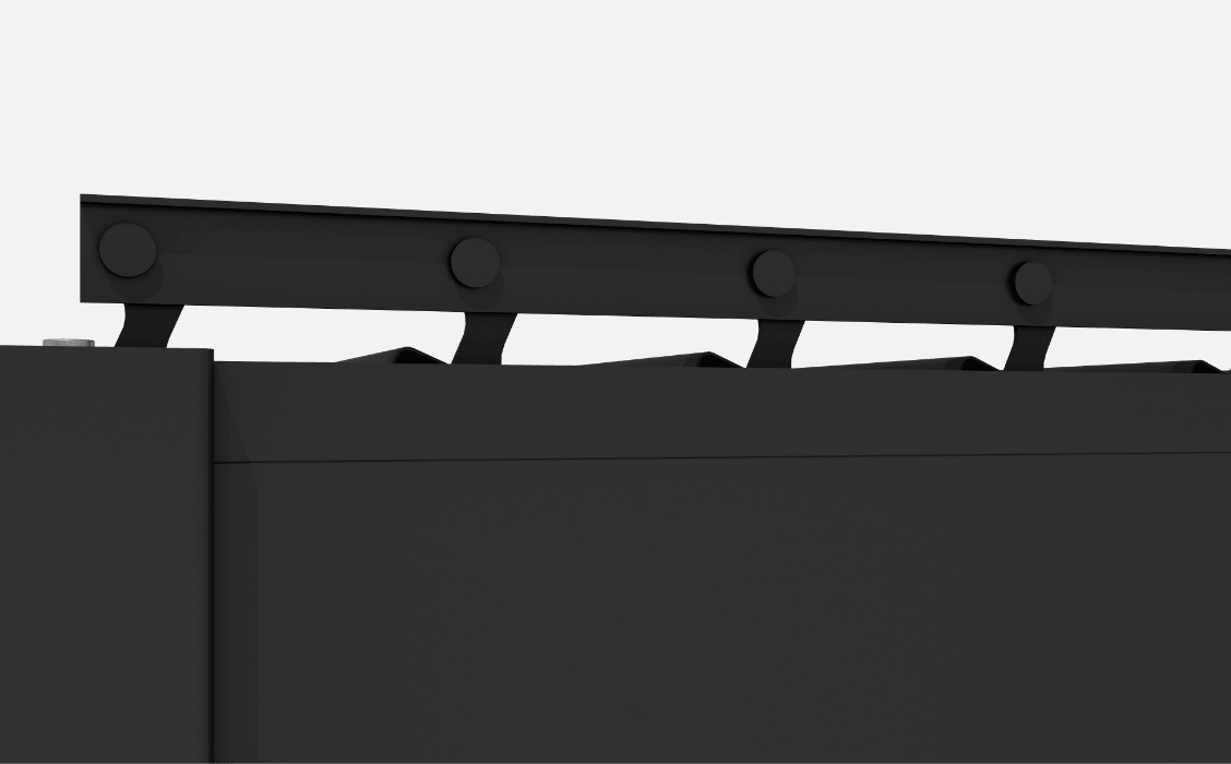 Tarp pergolos atramų įrengtos šoninės uždangos – nuotoliniu būdu valdomi medžiaginiai roletai apsaugo nuo permainingų oro sąlygų ir suteikia privatumo. Ši funkcija leidžia komfortiškai atsiriboti nuo išorės veiksnių, sutelkti dėmesį į atliekamą veiklą: darbą, skaitymą ar poilsį. Šoninės uždangos užsakomos esant poreikiui, už papildomą mokestį.