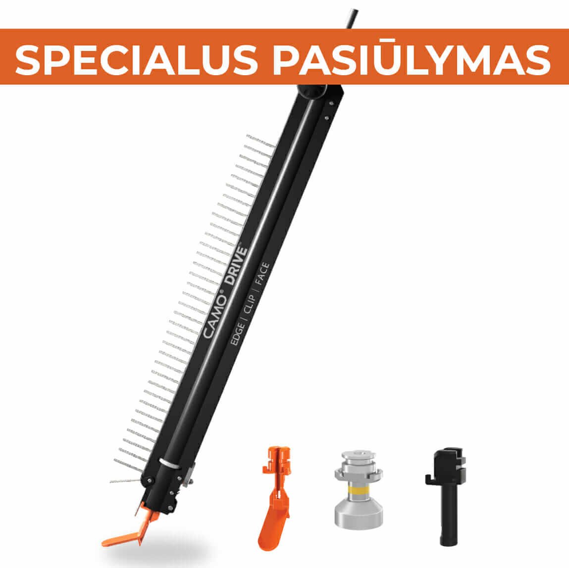CAMO Drive įrankis naudojamas išskirtinai su CAMO terasų varžtais juostose ir „EDGE ™ WPC“ tvirtinimais. Komplekte – ir antgaliai skirtingam tvirtinimo tipui. Įrankiui CAMO Drive pritaikytus „CAMO Protech“ medsraigčius juostomis rasite čia.
