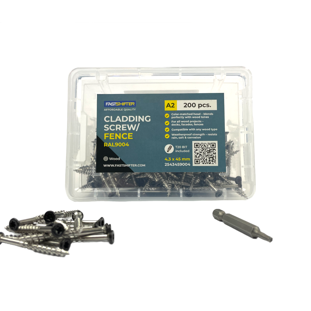 A2 nerūdijančio plieno Fastshifter medsraigčiai fasadui pasižymi aukštu atsparumu korozijai, todėl yra tinkami ilgalaikiam naudojimui lauko sąlygomis. Galite rinktis iš Antracito pilkos (RAL7016), Signal judos (RAL9004) arba Terra rudos (RAL8028) spalvos dažytos medsraigčio galvos. Tai suteikia modernią ir estetišką išvaizdą bei leidžia medsraigčiams harmoningai įsilieti į tamsių atspalvių fasado apdailą. Optimizuota sriegio geometrija užtikrina lengvą įsukimą, patikimą sukibimą su mediena ir tvirtą konstrukcijos stabilumą.