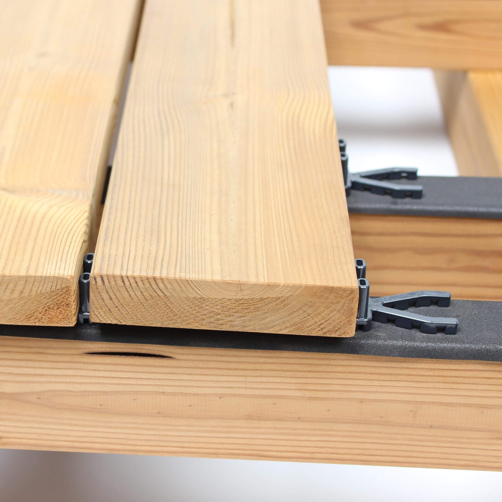 • Specialūs dantukai sudaro vienodus tarpus tarp lentų – terasa atrodo tvarkingai, o montavimas tampa greitesnis ir tikslesnis.