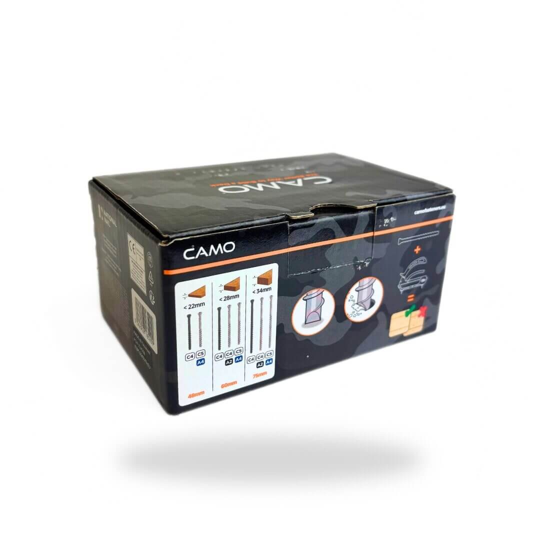 Medsraigčiai terasai CAMO C4 ProTech. CAMO nematoma terasos tvirtinimo sistema – revoliucija terasinių lentų tvirtinimo srityje, grįsta paprastumu. Ši technologija leidžia terasos medsraigčius paslėpti lentų kraštų briaunose, todėl yra vadinama nematomu arba paslėptu tvirtinimo būdu. CAMO medsraigčiais ProTech sukuriamas gražus, lygaus terasos paviršiaus be varžtų vaizdas, suteikiantis estetinį švarumo, modernumo ir saugumo vaikščioti basomis pojūtį.