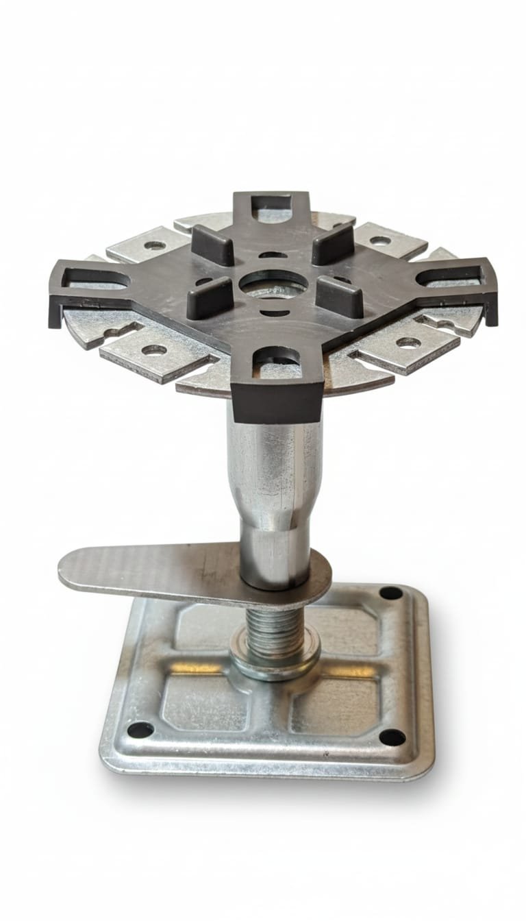 Reguliuojamas metalinis pjedestalas plytelėms (pasirenkamo aukščio) su cinkuoto plieno konstrukcija ir PA66 galvute. Nedegus (A klasė), atsparus korozijai, iki 800 kg apkrova.