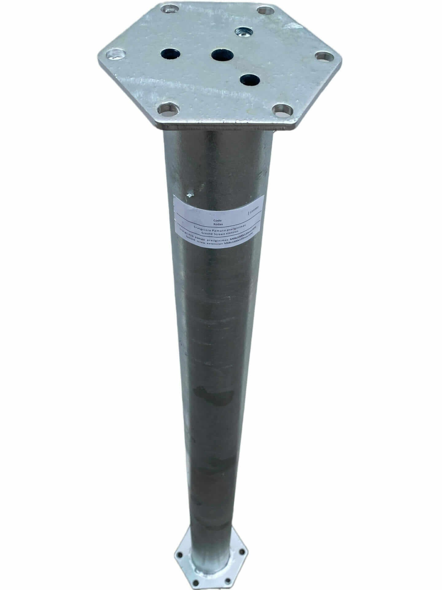 Šešiakampės plokštelės formos M tipo sraigtinio pamato prailginimas. Skirtas pakelti koloną, karkasą ar kitą konstrukciją.